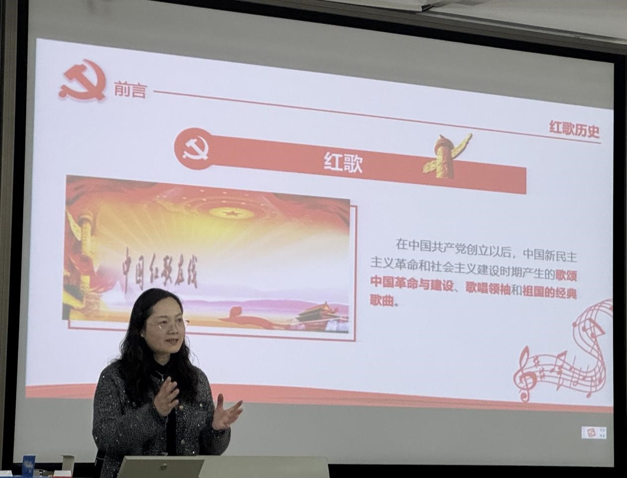 钱书记从中国共产党的初心和使命、红船精神具体内涵引入,带同学们欣赏了雷佳的《请放心吧祖国》。接着,钱书记以时间为线索,从新民主主义革命时期、社会主义革命和建设时期、改革开放和社会主义现代化建设时期到中国特色社会主义新时代,生动讲述了红歌创作的时代背景和艰辛历程。她带领同学们学唱《三大纪律八项注意》这首土地革命时期的经典红歌,同学们认真学唱,沉浸其中,感受红歌的魅力,体会信仰的力量。