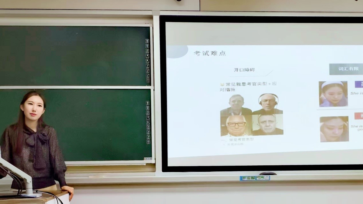 随后,楼丹老师聚焦“语言备考策略与衔接”,为同学们拆解了留学申请的关键一环。她清晰对比了四六级与雅思托福随后考试的区别,并针对听力、阅读、写作、口语四大板块,提供了系统的备考方法与提升技巧。她特别指出了中国学生在口语与写作输出上的常见难点,建议同学们尽早启动、科学规划,实现从校内英语到国际化语言能力的顺利过渡。