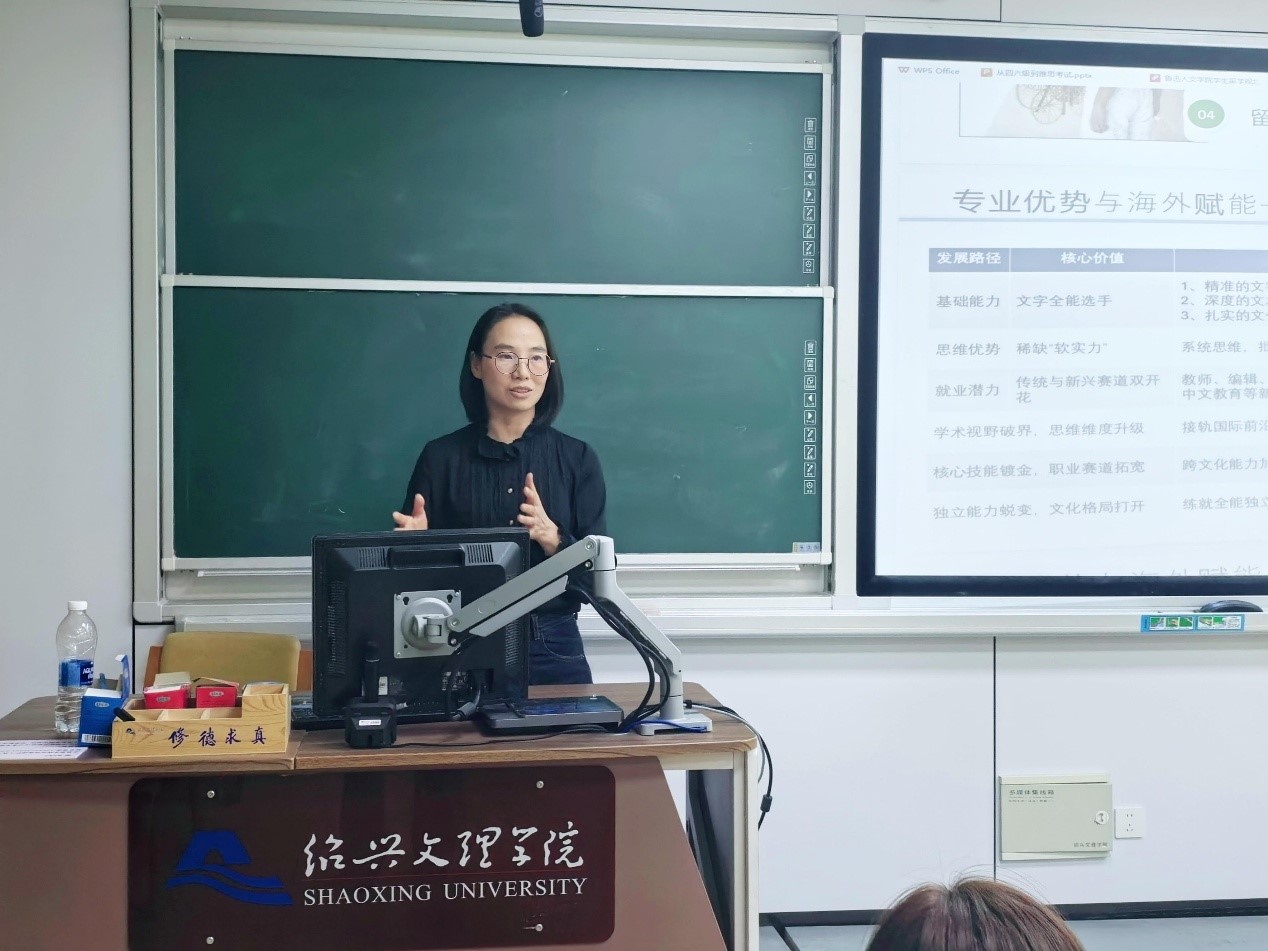 在分享会上,张小燕老师围绕 “留学规划与专业赋能” 展开深入讲解。她从汉语言文学专业的学科特质与就业现状出发,结合十年行业经验,阐述了如何通过海外经历为人文背景 “赋能” ,从而在“跨文化沟通”、“数字人文”等新兴领域开辟差异化发展路径。张老师还系统梳理了主流留学国家的选择策略与申请时间线,并强调“保持高绩点是申请名校的基石”,鼓励同学们尽早规划,提升综合竞争力。
