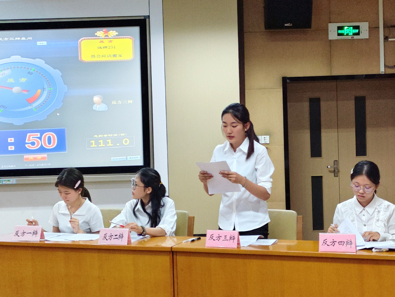 第一场比赛由正方历师251班与反方汉师251班就“愚公应该移山还是搬家”这一论题展开辩论。正方秉持“愚公应该移山”的观点,认为移山体现了坚韧不拔的意志、勇于挑战的精神,从文化传承、精神激励、责任担当三个层面阐述移山的价值,以此证明愚公移山的合理性。反方则持“愚公应该搬家”的观点,主张在面对困境时应审时度势、灵活变通,从资源利用、效率提升、生活改善三个层面分析搬家的优势,进而得出“愚公应该搬家”的结论。最终,反方汉师251班在此次辩论中胜出,正方历师251班同学蒋依静荣获“最佳辩手”称号。赛后,由评委徐浩然对比赛进行点评,他指出辩手应该紧扣辩论核心,明确辩论思路,有效的将实例转换为辩论依据,注意避免多次出现“请对方辩手重复问题”的低效互动。