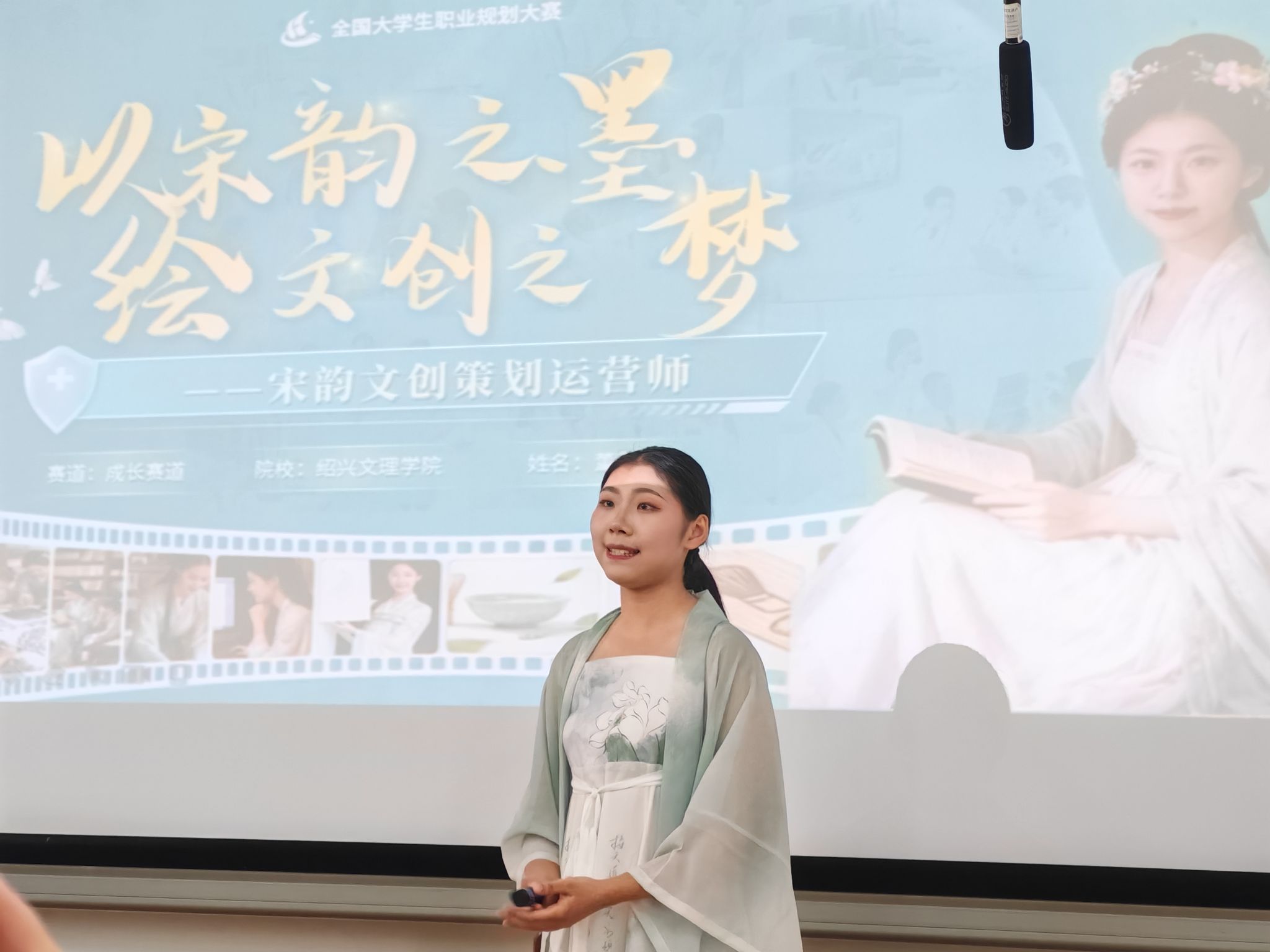 一号选手董莹莹立志弘扬宋韵文化,她的职业愿景是成为一名宋韵文创策划运营师,以文创为发力点推广宋韵文化,在她的讲述中可以看到扎实的文学底蕴以及丰厚的文化素养为弘扬宋韵文化打下良好基础。