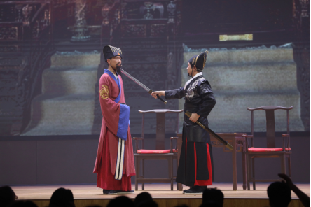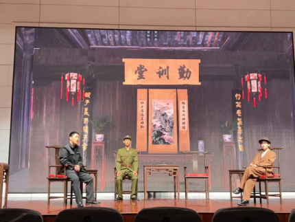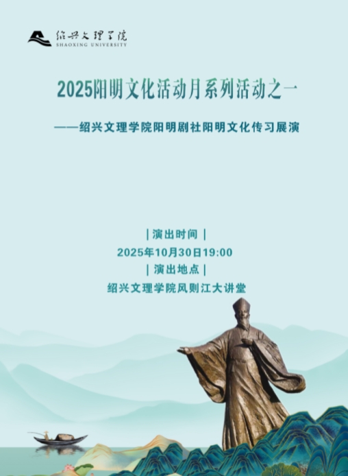 绍兴文理学院阳明剧社成立于2009年,致力于以话剧艺术为载体,推动绍兴优秀传统文化“活起来”,探索阳明文化的创新发展。剧社原创话剧《千古一圣王阳明》由学生自编、自导、自演,相关剧目已走进中小学演出十余场,并受邀在2020年全国阳明心学大会上展演,获得多家媒体近百次报道。王阳明系列话剧两次荣获省大学生艺术节二等奖。经过十余年实践,剧社构建了“研•创•演•评”育人体系,成为学校传承文化、开展思政教育的特色品牌。