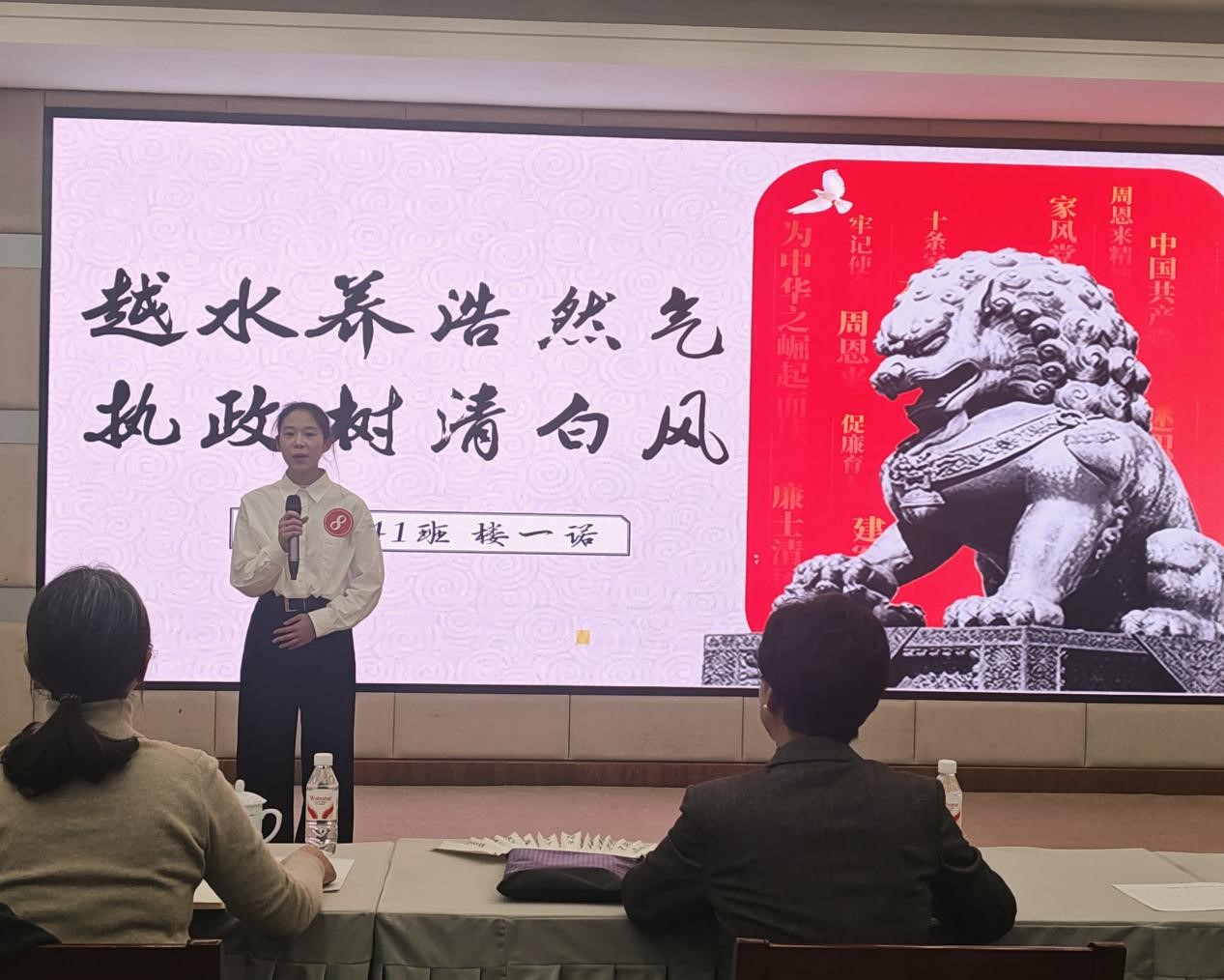 决赛中,选手们紧扣“廉洁”主题,深入挖掘越地清廉元素、清官廉吏典故,紧密结合所学专业特色,从崇尚以廉为美、内化价值观念、坚守学术诚信、恪守职业操守、杜绝弄虚作假、维护公平正义等多个维度谈感悟、讲思考,有的选手以探究越医廉脉,从绍派伤寒智慧中探寻廉洁修身之道;有的选手对王冕《墨梅图》中的诗书画进行专业解读,追溯名士清风,探寻现实启迪;有的选手寻迹浙东运河,梳理绍兴三江闸的建造史,号召同学们做新时代的“建闸人”,守住心中的“三江闸”;有的选手深入挖掘“一钱太守”刘宠、“正直守节一完人”刘宗周、“人民总理”周恩来等越地清官廉吏忠心为国、勤政奉公、清正廉洁故事,深刻思考廉洁文化古今践行之道,充分展现了我校学子学廉强基、知廉明向、崇廉修身、践廉笃行的良好精神风貌。