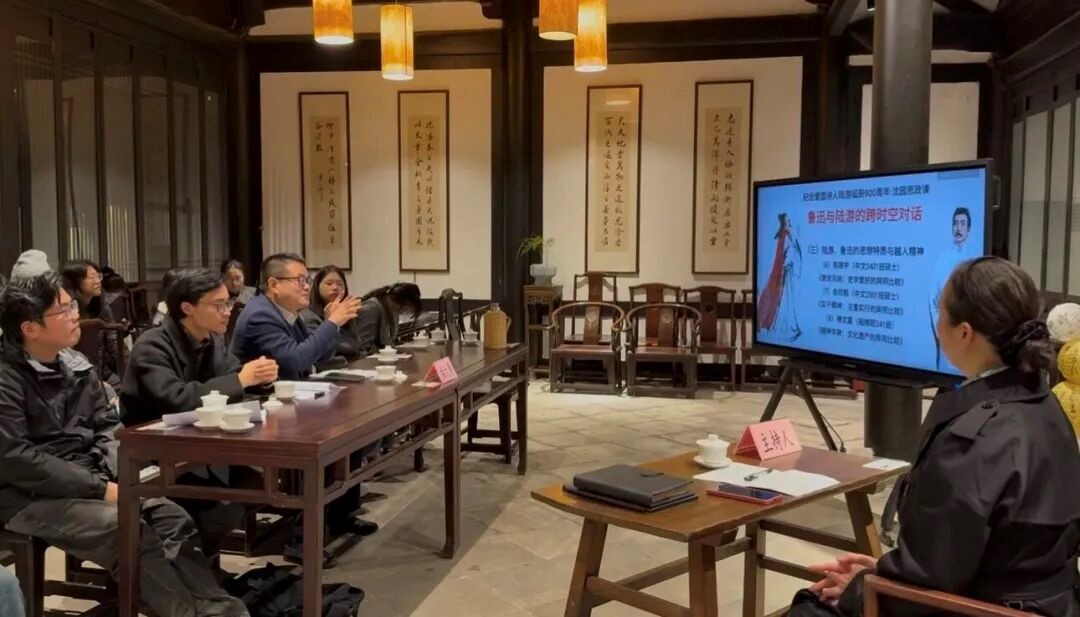 其中,绍兴文理学院鲁迅人文学院、绍兴市鲁迅研究会、绍兴文理学院研究生院和绍兴鲁迅故里·沈园公司共同推出了“纪念爱国诗人陆游诞辰900周年·沈园思政课——鲁迅与陆游的跨时空对话”活动。绍兴文理学院鲁迅人文学院党委书记钱晓萍出席活动,绍兴市鲁迅研究会副会长周玉儿主持了活动,绍兴文理学院鲁迅人文学院古大勇教授作点评。本次活动属于绍兴文理学院鲁迅人文学院卓光平老师所开设的研究生课程《鲁迅与两浙文化研究》的一部分,共有来自该课程的8位同学从生命意识研究、文本细读分析和横向比较研究三个角度,讲述了从爱国诗人陆游到“民族魂”鲁迅的精神传承和创作承续。