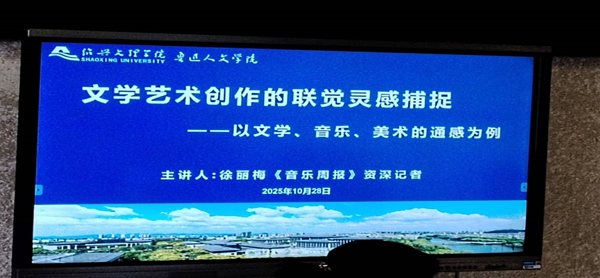 10月28日上午,《音乐周报》资深记者、乐评人徐丽梅老师应邀来到绍兴文理学院鲁迅人文学院,举办了一场题为《文学艺术创作的联觉灵感捕捉——以文学、音乐、美术的通感为切入口》的学术讲座。本次讲座由范永康教授主持,2025级祖楠班全体同学和部分研究生参加了此次讲座。