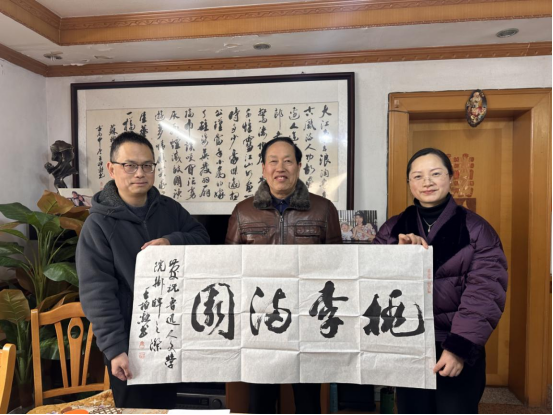 在探望过程中,钱晓萍书记、徐浩副书记与王柏勋老师亲切交谈,细致询问了他的身体状况与退休生活,对王老师多年来在教书育人和弘扬传统文化方面所作出的卓越贡献表示衷心感谢。钱书记表示,王老师不仅是深受学生爱戴的优秀教师,其深厚的书法造诣与执着追求的艺术精神,更是学院宝贵的文化财富,激励着后学。