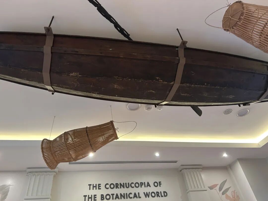 同与海洋“打交道”,同处水流涌现之地,船舶文化是越文化与娘惹文化不可或缺的一部分,承载着人与自然和谐相处的印记。我们踏入新加坡植物园的小博物馆,抬头便撞见一艘古旧的木质船悬于天花板——深褐色的船身泛着岁月的痕迹,仿佛刚从马六甲海峡的风浪里驶来。
